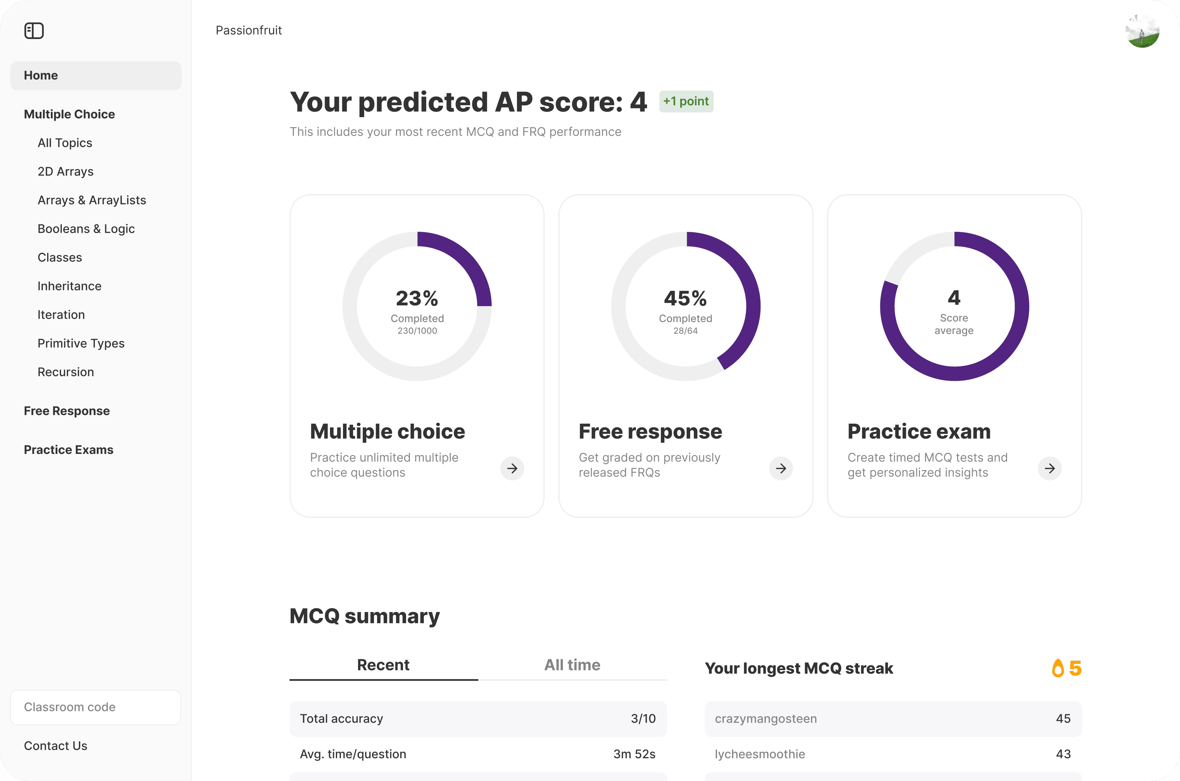 "Overall passionfruit was a great tool to practice questions that represented the topics that appear on the exam and I thought the graded FRQs were especially helpful.