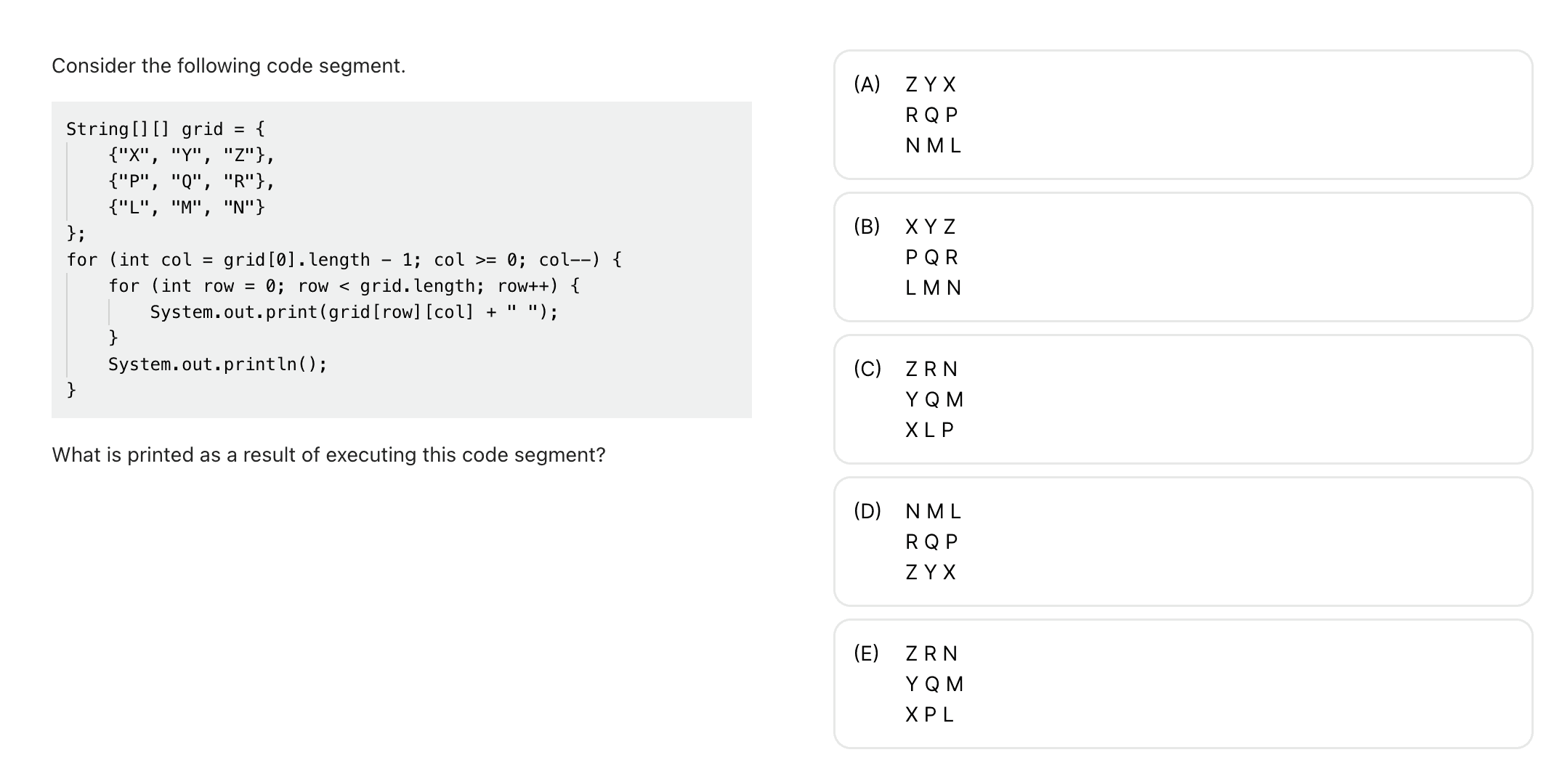 Exactly what is printed or changed each pass?System.out.print(grid[row][col] + " ");This just prints the item at[row][col].What the question is asking for